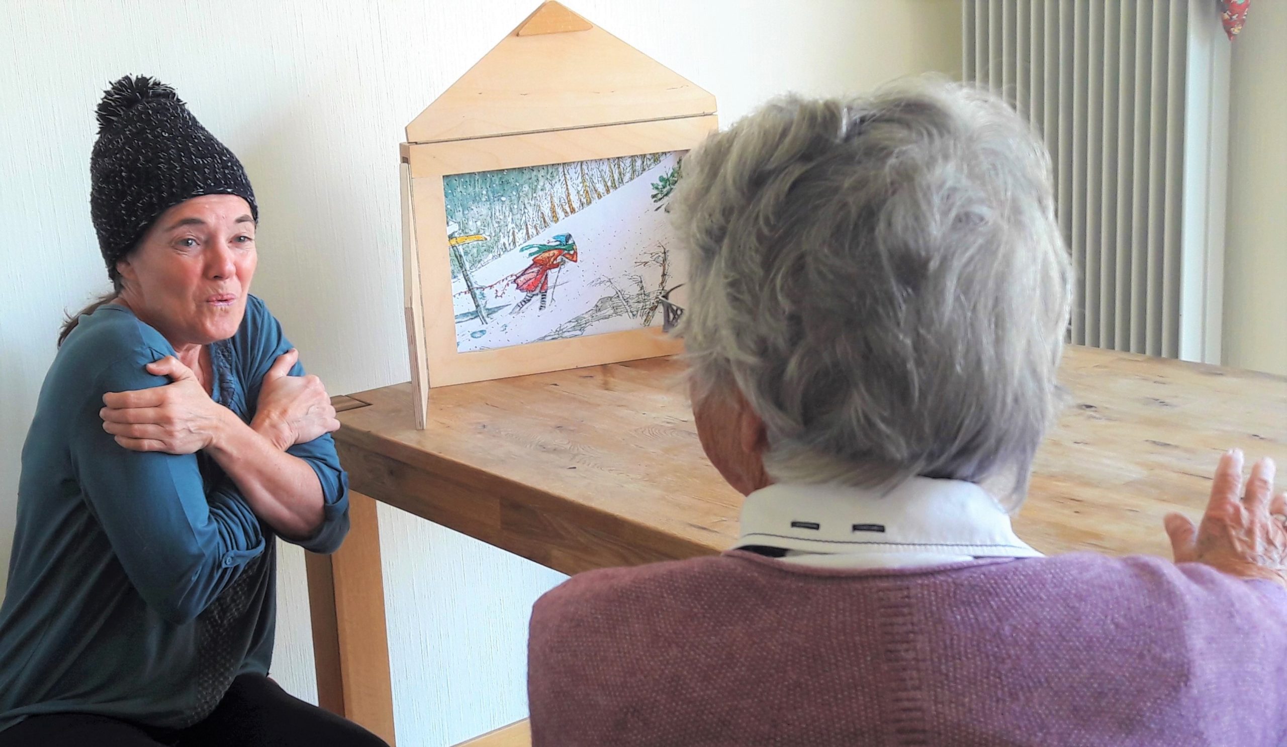 Quand un narrateur/une narratrice kamishibai se rend à l’hôpital, en institution ou en EMS, il/elle prépare son castelet dans la chambre de l’adulte, au salon, dans la salle communautaire ou dans un autre endroit mis à disposition.
